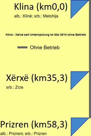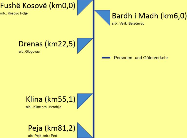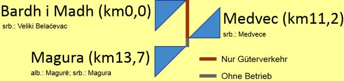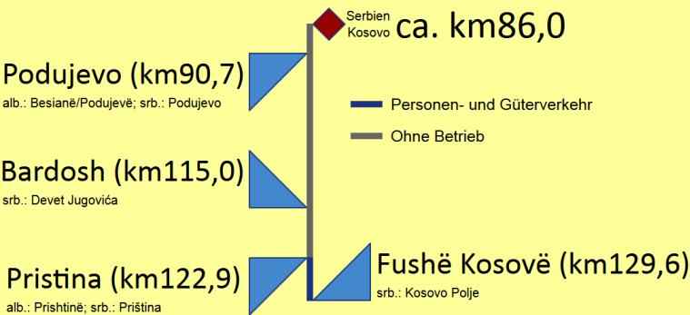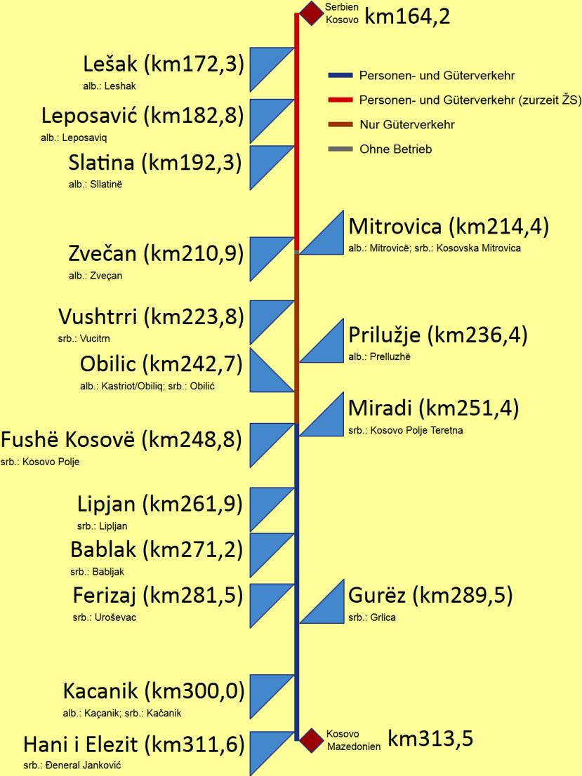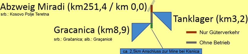 ![]() ![]() ![]() ![]() ![]() ![]() Gesamt: 355 km 152,6 km mit Personen- und Güterverkehr (Trainkos) 49,4 km mit Personen- und Güterverkehr (ŽS) 48,8 km nur mit Güterverkehr 104,2 km ohne Betrieb. |