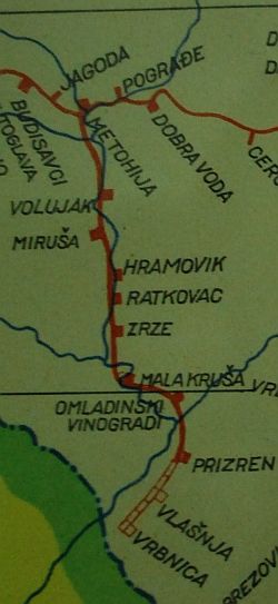 Das fruchtbare Ackerland, welches die Strecke durchquerte, sorgte für regelmäßig hohes Güteraufkommen in Form von Getreide und anderen landwirtschaftlichen Produkten. Zu den Zeiten Jugoslawiens fuhren jedes Jahr vor Weihnachten Ganzzüge Wein zur Glühweinherstellung nach Deutschland ab. Diese saisonalen Güterzüge bekamen Vorfahrt vor allen anderen Zügen. ![]() Es gibt Planungen, die Strecke über Prizren hinaus nach Albanien zu verlängern. Grund hierfür ist zum einen der Wunsch, zukünftig vom Güterverkehr in West-Ost Richtung auf dem Balkan zu profitieren, zum anderen wurde im Februar 2009 von Albanien dem Kosovo die Nutzung des Adria-Hafens Shëngjin zugesagt, sodass Güter hier auch mit der Bahn in den Kosovo transportiert werden könnten. Über immer wiederkehrende Willenserklärungen ist diese neue Bahnlinie allerdings bislang nicht hinausgekommen. Zumindest, was das Gebiet des Kosovo angeht, ist eine solche Verlängerung nicht neu. Auf einer Eisenbahnkarte Jugoslawiens aus dem Jahr 1966 ist eine Verlängerung der Strecke bis zum Grenzort Vërmicë (srb: Vrbnica) bereits als geplant eingezeichnet. ![]() ![]() |