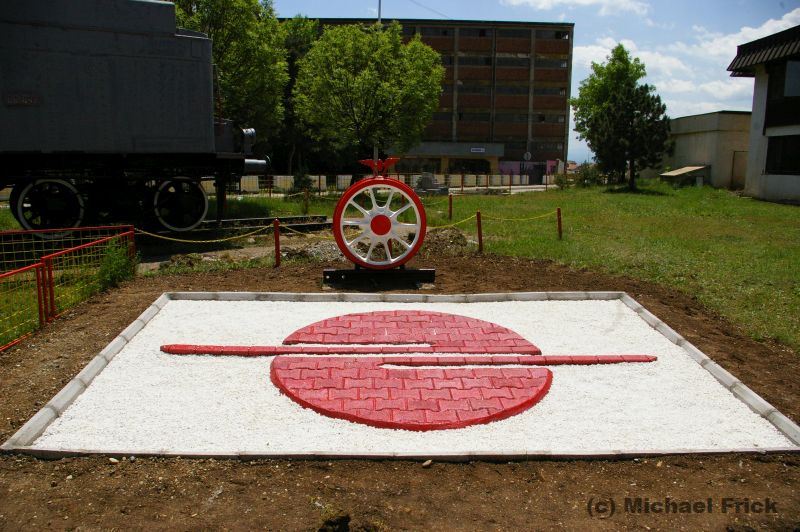 das Symbol der Kosovo Railways und das dahinter befindliche Speichenrad